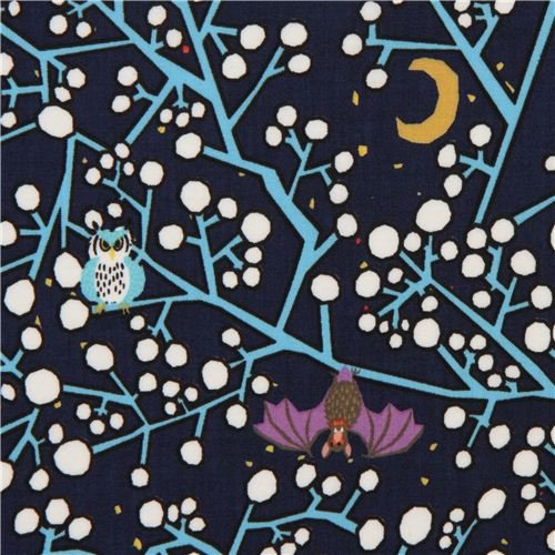Tissu Kokka bleu nuit avec des hiboux et des chauves-souris